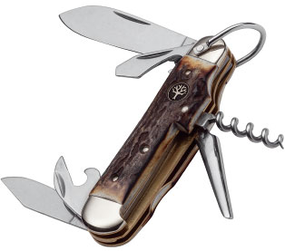 Ausgestattet ist es mit zwei Klingen, einem Dosen- und Flaschenöffner, einer Stech- und Reibahle sowie einem Korkenzieher und einem Schlitzschraubendreher. Beide Klingen werden aus 4034er Stahl gefertigt, dem klassischen Solinger Klingenstahl, der Korrosionsresistenz, Schnitthaltigkeit und leichte Nachschärfbarkeit miteinander verbindet. Das Urgestein unserer Modellpalette hat polierte Neusilber-Backen und strapazierfähige Schalen aus echtem Hirschhorn. Dank des praktischen Fangriemenbügels kann das Messer einfach an Taschen oder anderen Gegenständen befestigt werden.